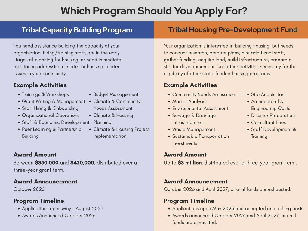 The Tribal Housing Pre-Development Fund is a grant opportunity that funds pre-development activities related to building affordable housing. These include planning, infrastructure, construction, site preparation, and other activities. The fund’s priority is to increase preparation to build affordable housing and access other state-funded, affordable housing programs.